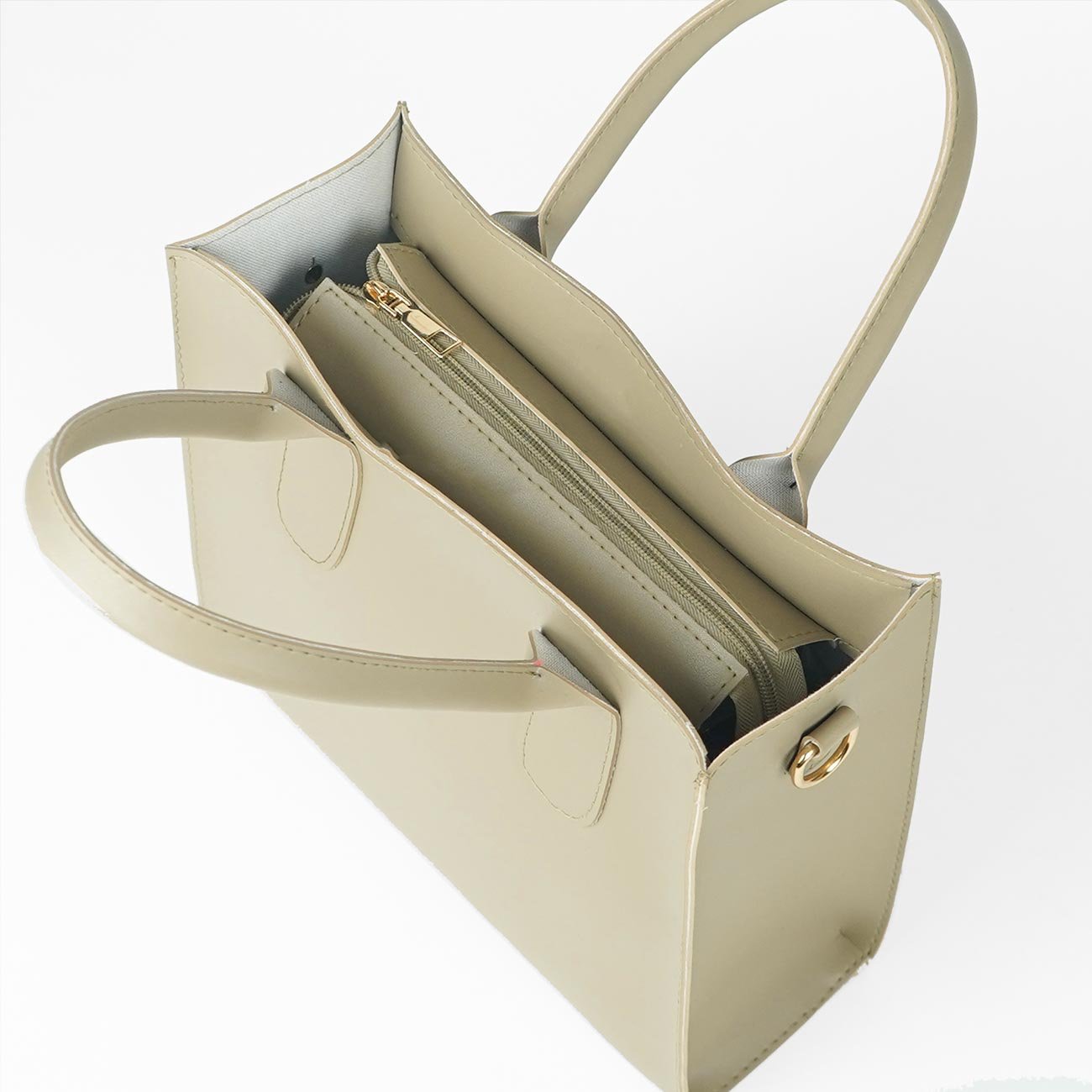 – Single compartment with top zipper closure.